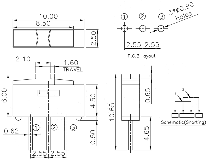 引腳設(shè)計:三腳直插式(公共端居中),采用鍍金PC引腳,提升導(dǎo)電性與耐腐蝕性 。